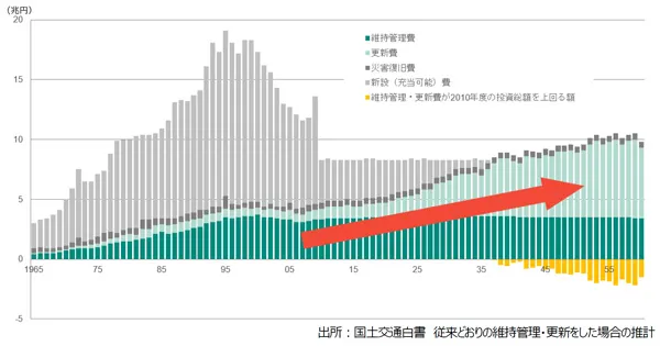 不動産ストック・インフラの維持管理コストの増大し、2037年度には社会資本の維持管理・更新費が投資総額を上回り、今後50年間に必要な更新費は約2割不足(約30/約190兆円)。今後、効率の良い建物保全必要になってきます。