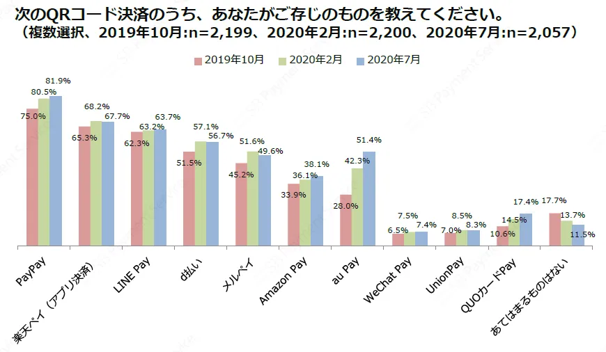 QRコード決済のうち、ご存知のサービスを尋ねたところ、2020年7月の調査では1位が「PayPay」で81.9%の方が認知していました。2位が「楽天ペイ(アプリ決済)」で67.7%、3位が「LINE Pay」で63.7%という結果になりました。2019年10月の政府による「キャッシュレス・ポイント還元事業」開始以降、QRコード決済の認知率は上昇を続けており、「キャッシュレス・ポイント還元事業」前後では「au Pay」が最も伸び率が高く、23.4%上昇しました。