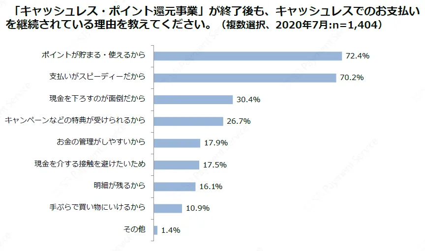 キャッシュレスでのお支払いを継続している理由としては、「ポイントが貯まる・使えるから」(72.4%)、「支払いがスピーディーだから」(70.2%)、「現金を下ろすのが面倒だから」(30.4%)などが主な理由として挙げられました。