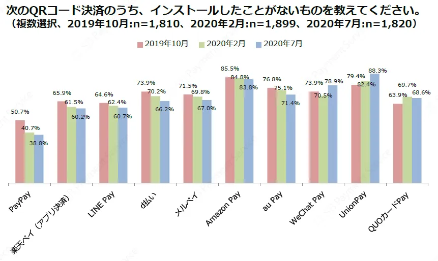 QRコード決済をご存知の方にQRコード決済の利用状況を尋ねたところ、アプリをインストールしたことのないQRコード決済の割合は、2020年7月の調査では「PayPay」が38.8%で最も少なく、また、20回以上支払いに利用したQRコード決済の割合も「PayPay」が26.4%で最も高いことが分かりました。