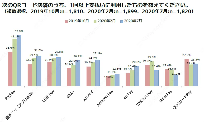 「PayPay」「楽天ペイ(アプリ決済)」「LINE Pay」など7種類の決済で利用率が上昇