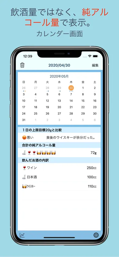 親しみやすいカレンダー型のホーム画面の中で、過去の飲酒量も一覧できるように工夫。長期の推移は別画面で線グラフで表示します。純アルコール量も数字以外に、絵文字など棒グラフで視覚的に表示します。