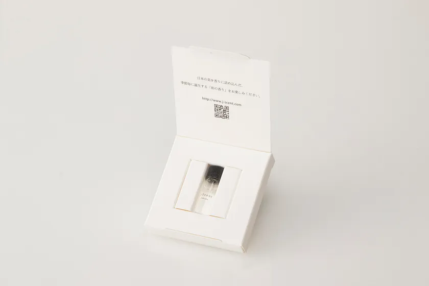 まるでJ-Scentオードパルファンのパッケージをそのままミニチュアにしたかのような、シンプルなデザイン。和紙を使用した温かみのある感触が、J-Scentの「和」の世界観を表現しています。