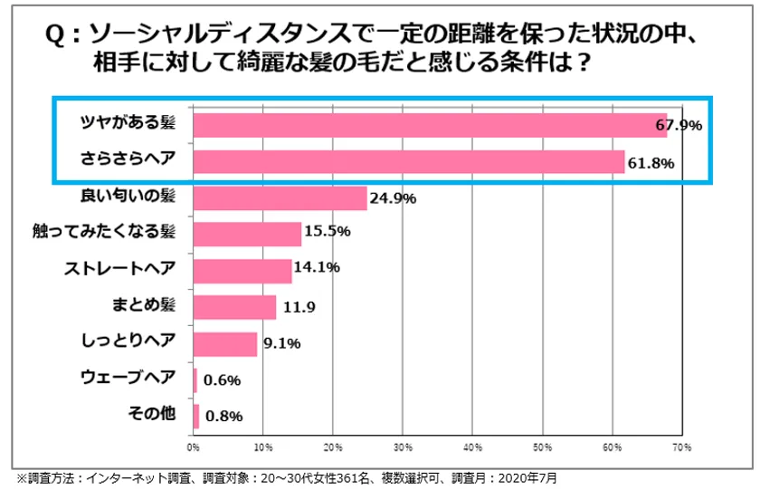 「ソーシャルディスタンスで一定の距離を保った状況の中、相手に対して綺麗な髪の毛だと感じる条件は?」の設問に対し、「ツヤがある髪」67.9%、「さらさらヘア」61.8%と答えた女性が過半数を超え、新しい生活様式の中でも、「ツヤがある髪」「さらさらヘア」は印象を左右する重要ポイントであることがわかりました。