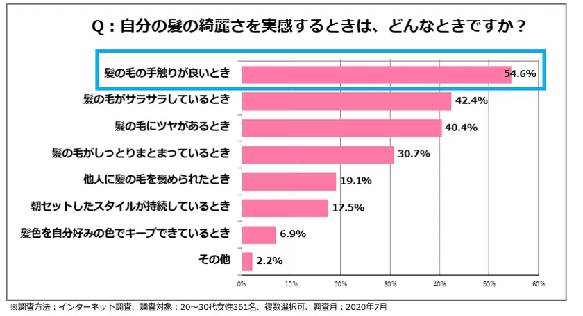 「自分の髪の毛の綺麗さを実感するときは、どんなときですか?」という設問に対し、「髪の毛の手触りが良いとき」と回答した女性が54.6%とトップに。見た目だけでなく、実際に触れたときの手触りの良さが、綺麗な髪の毛の条件として重視している方が多いという結果になりました。