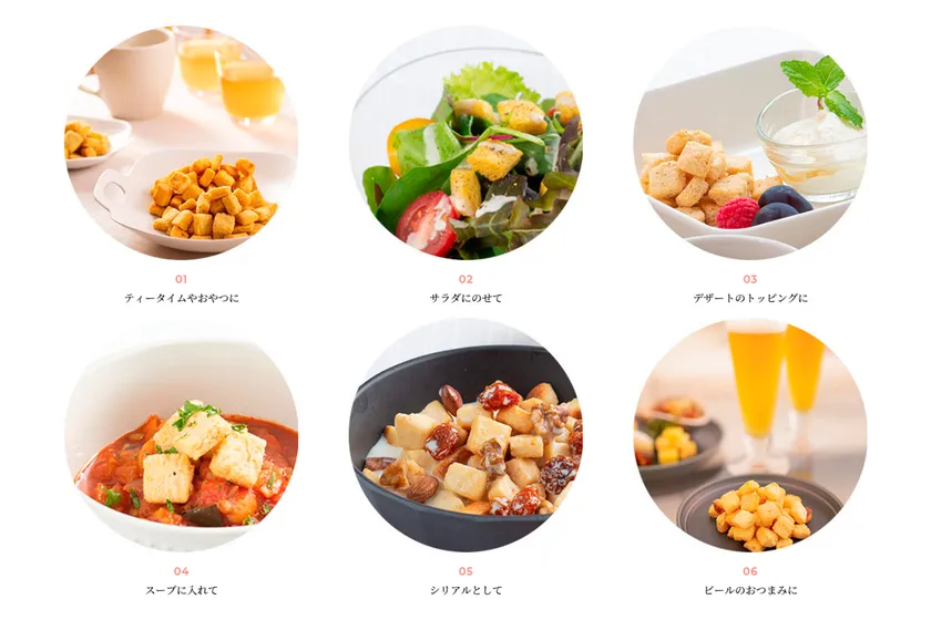お菓子ということにとらわれず、サラダやスープなど、「クルトン」としても、お楽しみいただけます。
