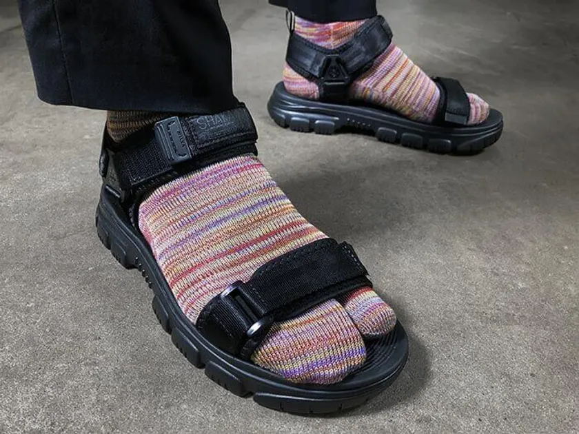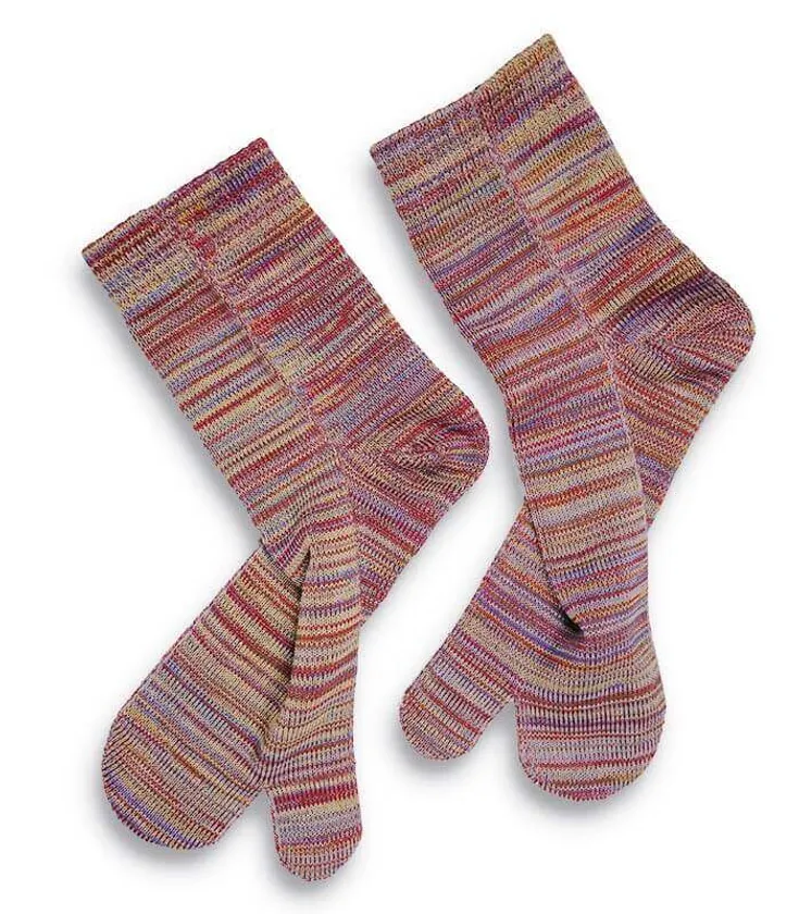 親指の分かれた足袋型のソックスは指先の踏ん張りがきくうえ履き心地がよく、それでいて五本指ソックスよりも脱ぎ履きがしやすいので下駄やビーチサンダル、スポーツサンダルや足袋スニーカー等に合わせた着用をはじめ普段遣いとしても幅広くご使用いただけます。