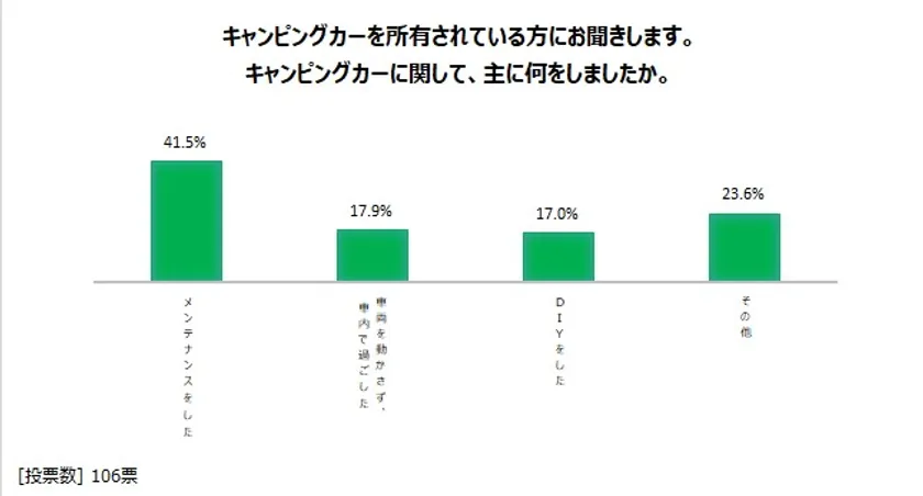 そこにフォーカスしてみると、「メンテナンスをした」と答えた人が最も多く41.5%(図表3)。また、「DIYをした」という人は17.0%見られることから、自粛期間が終わってからのくるま旅を楽しむために、愛車のケアやカスタムに精を出した人が多いことがうかがえます。