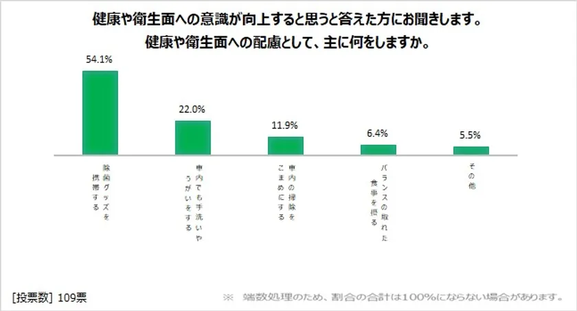 また、「はい」と答えた人に対して、「健康や衛生面への配慮として、主に何をしますか?」と聞いたところ、54.1%の人が「除菌グッズを携帯する」と回答(図表5)。
