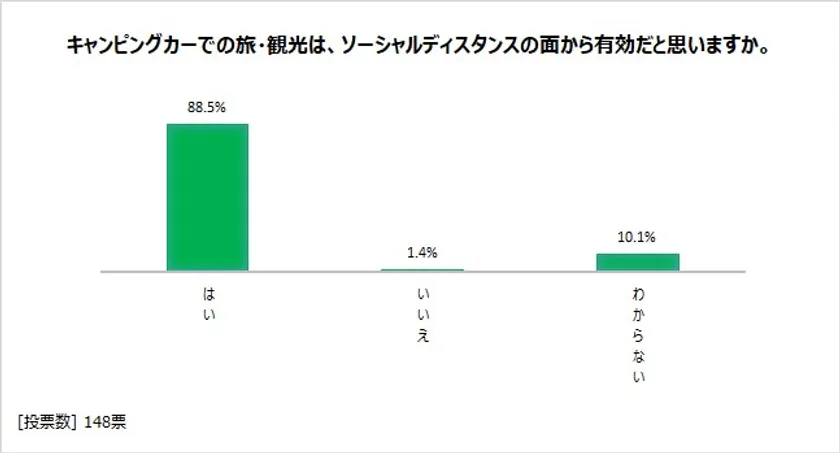 「キャンピングカーでの旅・観光は、ソーシャルディスタンスの面から有効だと思いますか?」との質問に対し、「はい」と答えた人は最多の88.5%にも上りました(図表8)。移動手段として、電車や飛行機などでの不特定多数の密集・密接・密閉が避けられるのは大きなメリットといえます。それだけではなく、車内で家の中と変わらず過ごせることも見逃せません。キャンピングカーは、旅先での新型コロナウイルスの感染防止に一役買うのではないでしょうか。