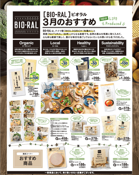 “BIO-RAL”とは、体に優しい素材や製法、健康や自然志向にあわせたプライベートブランド。「オーガニック」「ローカル」「ヘルシー」をコンセプトにこだわりの商品を取りそろえています。