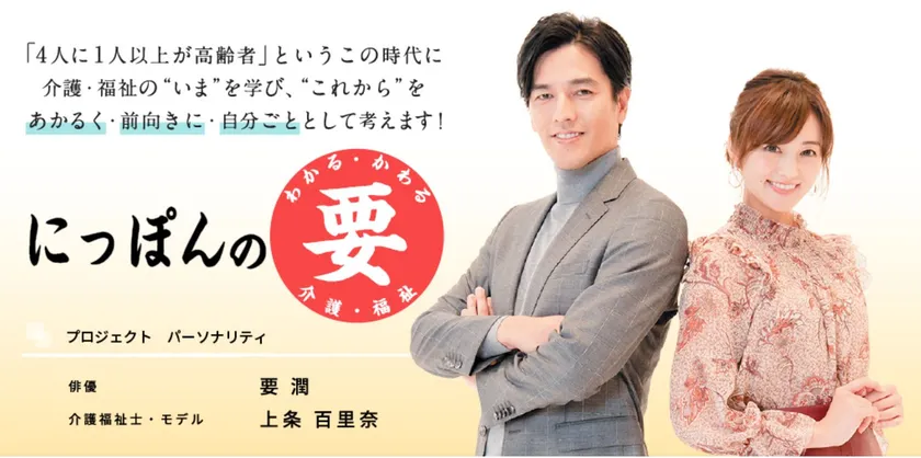また、2019年秋から既に5回放送し好評をいただいている、BSフジ『にっぽんの要~わかる・かわる介護・福祉~』では、引き続き俳優の要潤さん、介護福祉士・モデルとして実際の現場で活躍する上条百里奈さんがレギュラー出演し、さらにパワーアップした内容で第2シーズンをお送りいたします。
