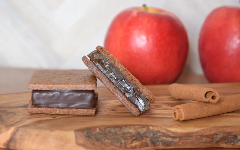 「GAKUチョコレートサンド~信州りんご~」は、そんな信州りんごの食感と味わいを最大限に活かしつつ、チョコレートとのハーモニーを生むために、大胆に信州りんごをごろっと挟み込みました。信州りんごがまるでそのまま挟まれているかのような食感を活かした形で提供することで、カカオの風味に負けることなく、むしろチョコレートの優しい味を引き出した、まさにりんごのチョコレートサンドに仕上がりました。