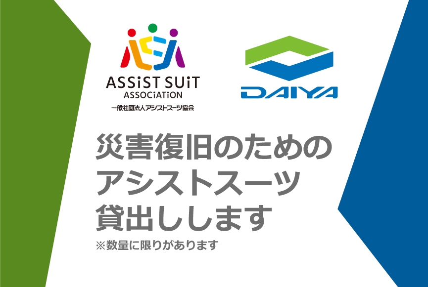 医療用品メーカーのダイヤ工業株式会社は、この度の震災被害への支援として、被災地のいち早い復旧・復興のためにボランティア活動等されている方に向けて、活動時の身体負荷を軽減する「アシストスーツ」を無償で貸出しいたします。アシストスーツ協会の一員として、復旧活動を行う皆さまの身体負担軽減のお役に立てればと願っております。ぜひお問合せくださいませ。