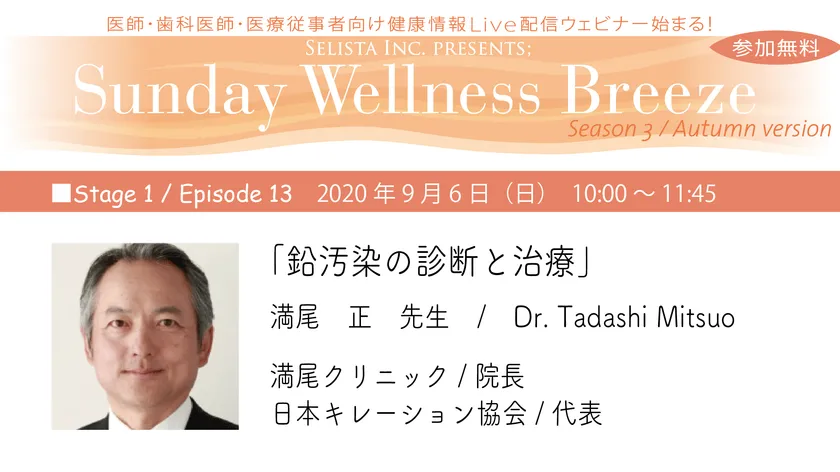 抗加齢・予防医療のプロ向け!無料Live配信Zoomウェビナー開催! 9月6日(日)朝10時『鉛汚染の診断と治療』 満尾 正先生(満尾クリニック 院長、日本キレーション協会 代表)