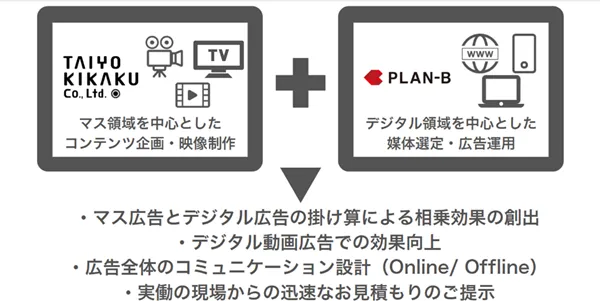 PLAN-Bと太陽企画、両社のノウハウと経験値を組み合わせることにより、お客様の課題に合わせた広告制作・マーケティング全体の統合的サポートで、企業の広告効果の最大化を目指してまいります。