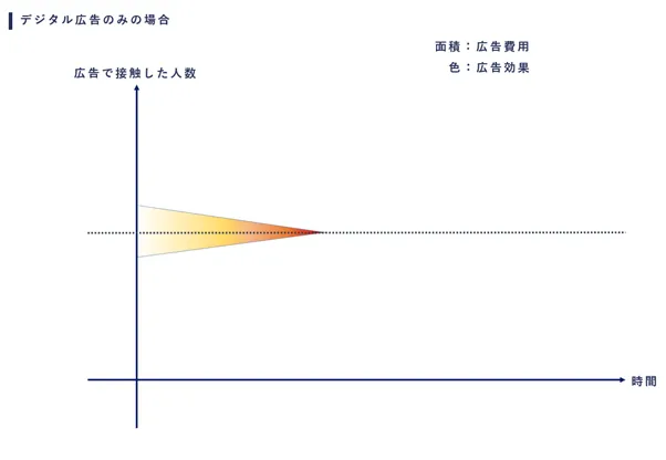 一方、デジタル広告のみでプロモーションを行った場合、少ない予算から始められるため継続的な施策が可能ですが、ターゲットや訴求を絞り込んで広告運用を行うという特徴から、広告によって接触できる人の数が少なくなるという課題があります。