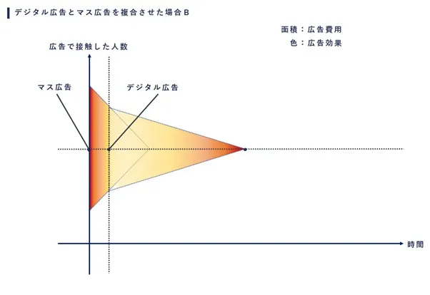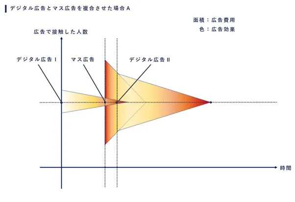 その後マス広告によって、デジタルで見つけた勝ちパターンを使ったクリエイティブをもとに、接触する人数を増やし効果を向上させます。そして再度デジタル広告を実施することで、マス広告で接触した人の獲得に向けて絞り込んでいきます。