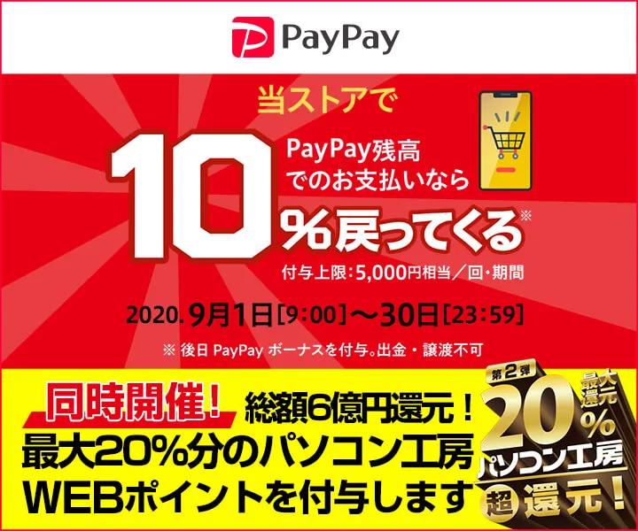 パソコン工房WEB通販サイトにて、PayPay残高でのお支払いなら 『またまたオンラインがお得!10%戻ってくるキャンペーン』『ペイペイジャンボ(オンライン)』を開催!