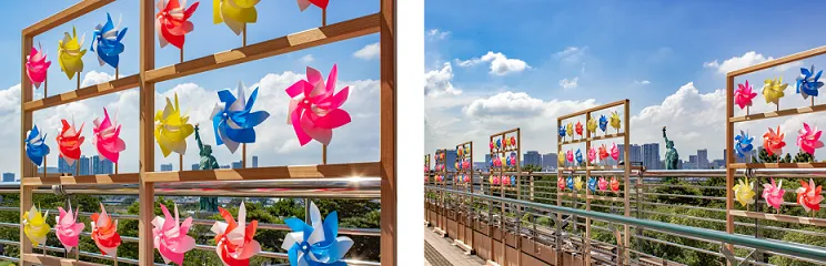 アクアシティお台場をイメージした海の青色、コロナ禍にある日本を応援し、元気づけるためのビタミンカラーに彩られた約700本のかざぐるまが、海風をうけて動く様子を一望いただけます。