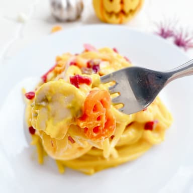 紫色が印象的な秋限定の紫芋のクリームパスタ「紫色のセレナーデ」と、ハロウィンにピッタリなかぼちゃクリームのパスタ「かぼちゃ畑のカーニバル」の2種類。
