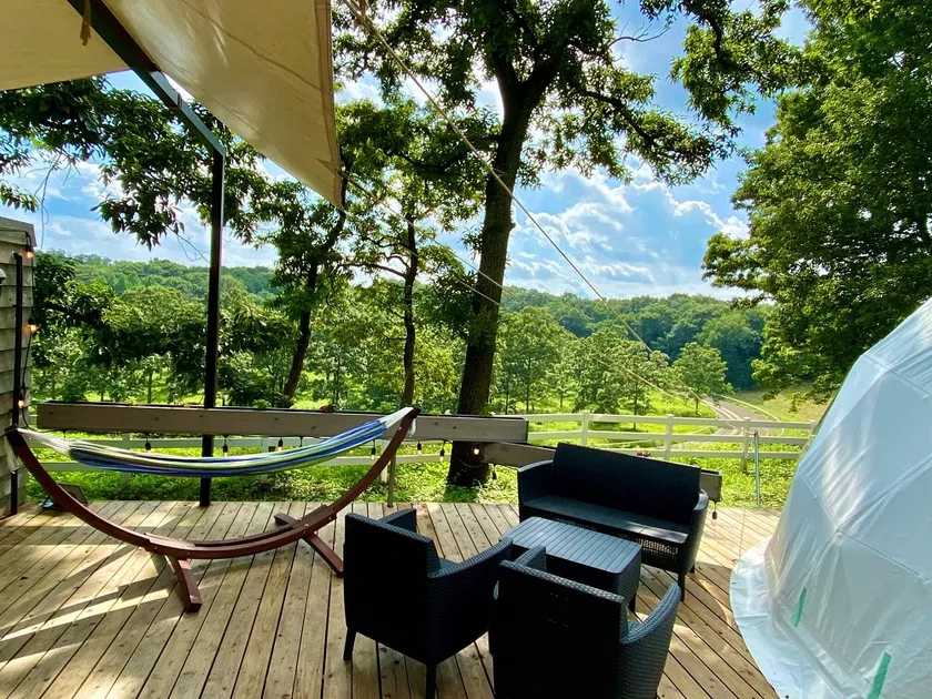 サラブレッドを育成する雄大な牧場と森林が広がる『Haga Farm & Glamping』。敷地内には、クヌギやメタセコイヤ、ポプラといったさまざまな種類の木々があり、色鮮やかに染まる美しい紅葉を楽しめます。例年の見ごろは10月下旬から11月中旬ごろです。秋の彩りを映す絶景のなかで、のびのびとグランピングを満喫できます。鳥のさえずりや葉擦れの音、秋虫の鳴き声など自然のBGMが心地よく響きます。