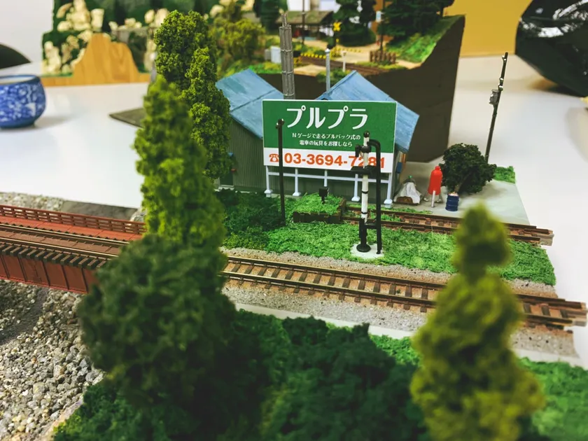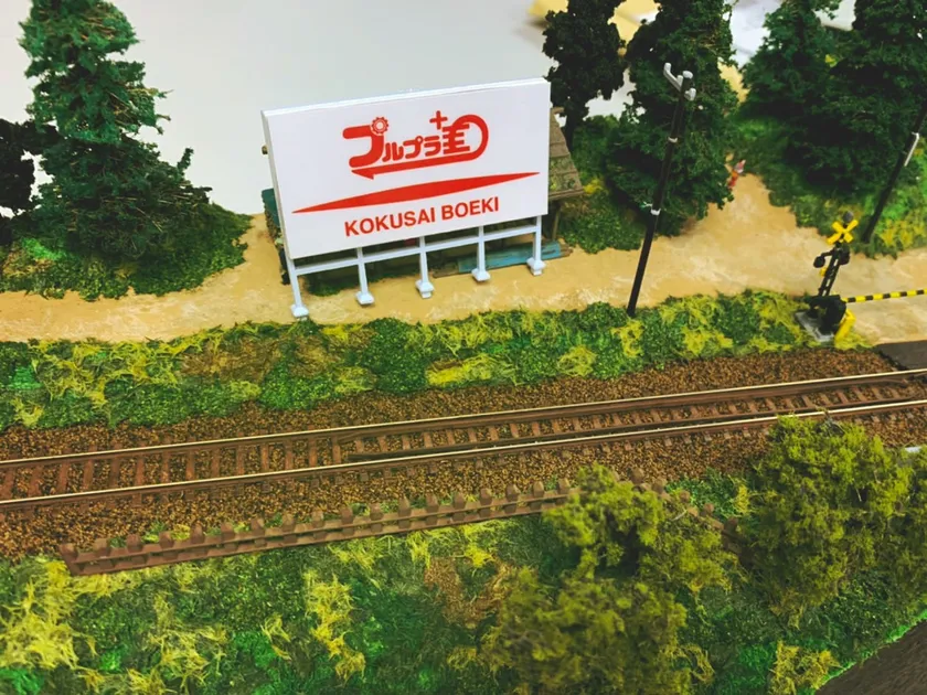 もともと鉄道ジオラマには、野立て看板を立てるという文化があるので、その内容が本物の広告に変わっても、ごく自然に馴染ませることができます。