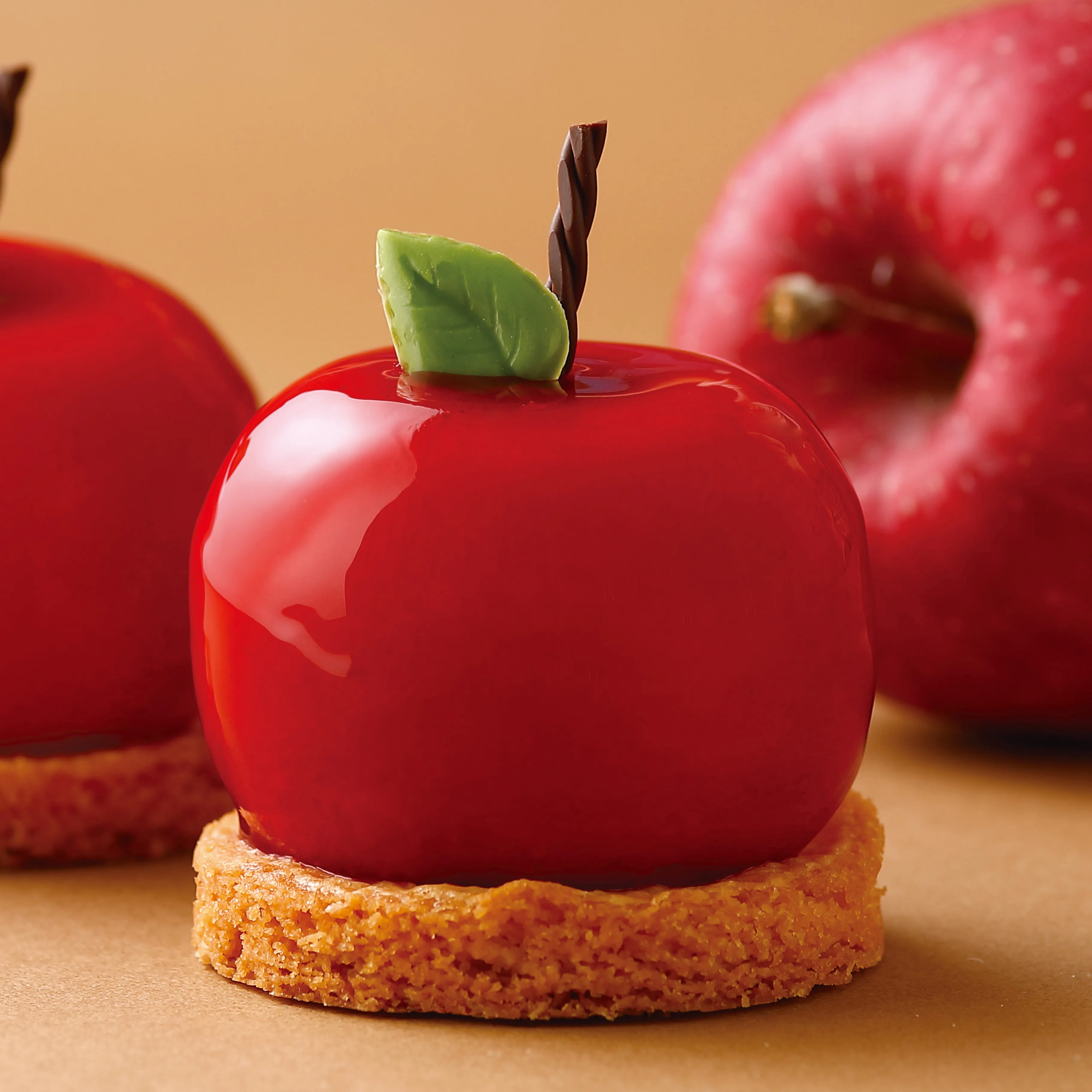 秋冬新作ケーキの「赤りんご」。りんごのムースの中にチョコムースとチョコスポンジが入っていて、赤いりんごのグラサージュでコーティングしました。