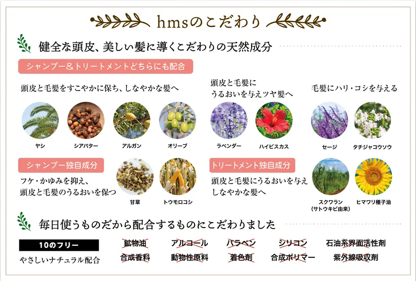 hmsは、髪に元気がない、パサつく、ヘタるなどの悩みを解消するために、特許取得のオーガニック製法で抽出した「幹発酵エキス」を世界で初めて配合したシャンプー&トリートメントです。この、生命の循環物質と呼ばれるフルボ酸・フミン酸からなる「幹発酵エキス」が、頭皮や髪に有効成分が浸透するのを助けます。