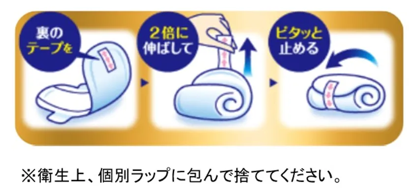 使用後は、ナプキン本体に付いている伸縮素材のテープを2倍に伸ばし、ナプキン本体のバックシートの粘着面を利用してテープをピタっと止め、くるっと簡単にまとめて捨てることができます。