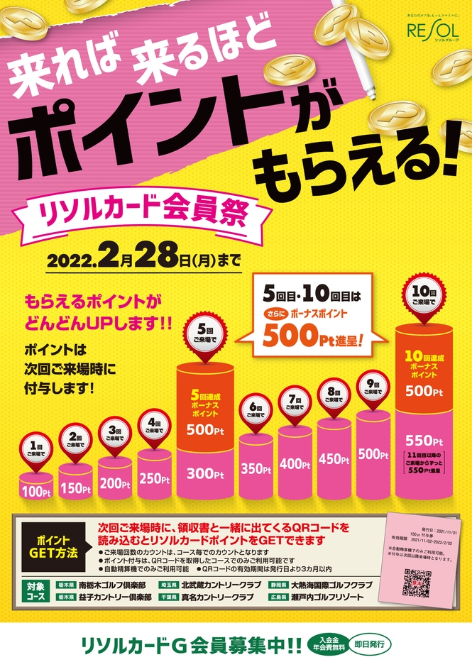 本企画は、ゴルフ場での精算毎に付与される通常ポイントの他に、来場ポイントとしてボーナスポイントが付与されます。しかも回数を増す毎にボーナスポイントも増え、5回10回時にはさらに達成ボーナスが加算されます。ポイントはレシートにQRコードが印字され、受付から精算までワンストップで行える「リソルカード ナビステーション(ナビステ)」で読取ります。本企画の対象者は<リソルカードG>会員となりますが、同カードは当日発行やWEB発行手続きも可能な“ポイントの見える”入会金や年会費がかからない無料のカードとなります。