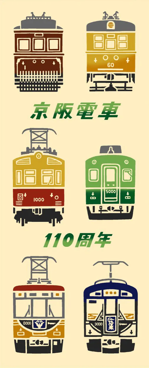 【概 要】京阪電車新旧車両の正面イラストを描いた日本製手ぬぐい