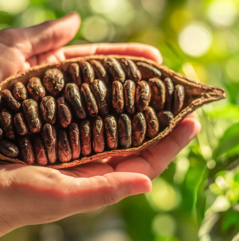 カカオニブとは、カカオ豆の胚乳を発酵・焙煎して粗く砕いたもので、これをすりつぶすとチョコレートやココアの原料となるカカオマスとなります。加工の度合いが低いことから、カカオニブは変質の度合いも低く、カカオの持つ健康効果をしっかり摂取することができる話題のスーパーフードです。