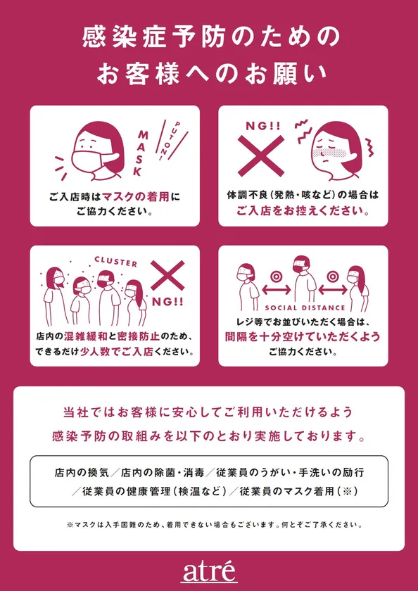 アトレ川崎では、お客様、従業員及び関係者の皆様の安全性を考慮し、新型コロナウイルス感染拡大防止の為の対策を講じます。また、来店されるお客様へのご協力のお願いがございます。
