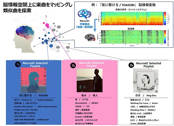 図1:“NeuroAI Selected Playlist” 特定の曲と類似した脳情報表現が推定された楽曲をリスト化