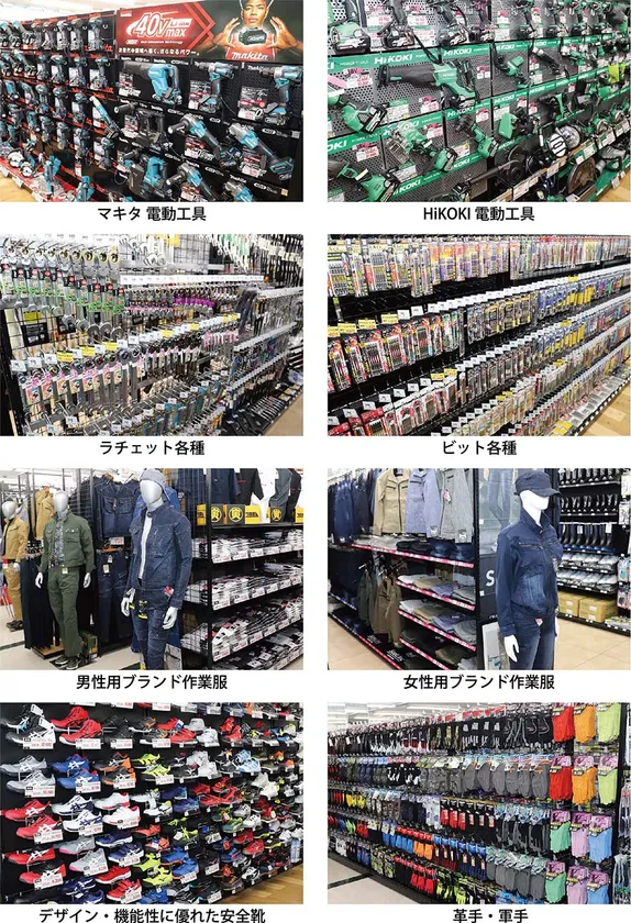 2号店は、1号店で培ったノウハウとエッセンスを凝縮し、今後の多店舗展開も見据えた新フォーマットでの出店となります。品揃えにおいては、建築・建設・土木・鳶・大工の業種をターゲットとした専門的な深い品揃えで、主に工具・作業服に特化・注力してまいります。