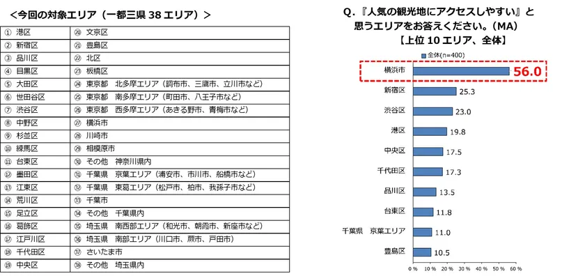 その結果、【横浜市】が「人気の観光地にアクセスしやすい」という項目において、38エリアで1位となりました(56.0%)。路線数11本の「横浜駅」(乗り入れ鉄道会社数日本一)や東海道・山陽新幹線が通る「新横浜駅」を有しており交通の便がよい横浜市ですが、路線数14本で日本一を誇る「新宿駅」を有する新宿区、全国でもトップクラスの路線数10本である「渋谷駅」を有する渋谷区など、名だたるエリアを抑えて1位となりました。25~44歳という観光地およびそのアクセスへの関心が高いであろう世代に行った調査で【横浜市】が1位となったことから、今後も交通の便がよい街として注目が集まりそうです。