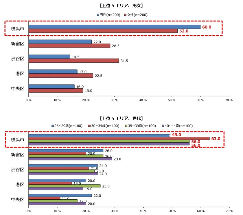 また世代別で見てみると、25~29歳が42.0%、30~34歳が40.0%でいずれも1位、35~39歳が38.0%、40~44歳が36.0%でいずれも2位となりました(1位は港区でそれぞれ43.0%、39.0%)。35~44歳という比較的年層の高い方が港区を選んでいるのに対して、25~34歳という若年層が横浜市を選んでいることから、次世代の「センスがよいエリア」として横浜市の期待が高まっていると言えるかもしれません。