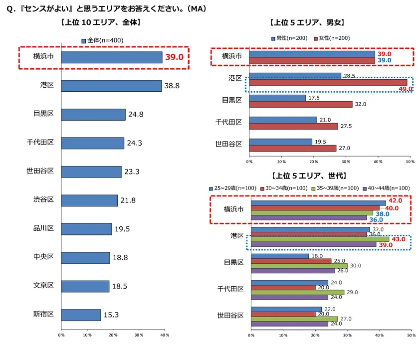 「センスがよいエリア」の結果を見てみると、全体では横浜市が39.0%で1位となりました。男女別で見ると、男性が39.0%で1位、女性が39.0%で2位でした(1位は港区49.0%)。女性からの人気が特に高かった港区とは異なり、横浜市は男女に差がなく選ばれていることが見てとれます。