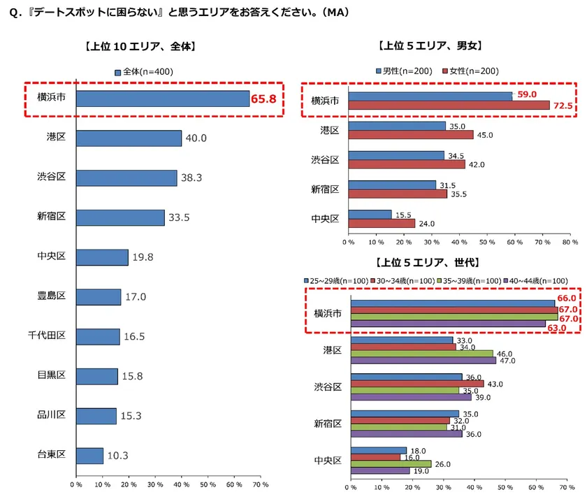 「デートスポットに困らないエリア」の結果を見ると、全体では横浜市が65.8%で1位となりました。男女別で見ると、男性が59.0%、女性が72.5%で、いずれも横浜市が1位でした。また世代別で見ても、25~29歳が66.0%、30~34歳が67.0%、35~39歳が67.0%、40~44歳が63.0%で、いずれの世代でも1位でした。