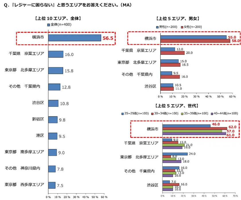 「レジャーに困らないエリア」の結果を見ると、全体では横浜市が56.5%で1位となり、2位の16.0%(千葉県京葉エリア)と40ポイント以上の差をつける結果となりました。男女別で見ると、男性が55.0%、58.0%といずれも1位でした。世代別で見ても、25~29歳が46.0%、30~34歳が62.0%、35~39歳が57.0%、40~44歳が61.0%で、いずれの世代でも横浜市が1位となりました。