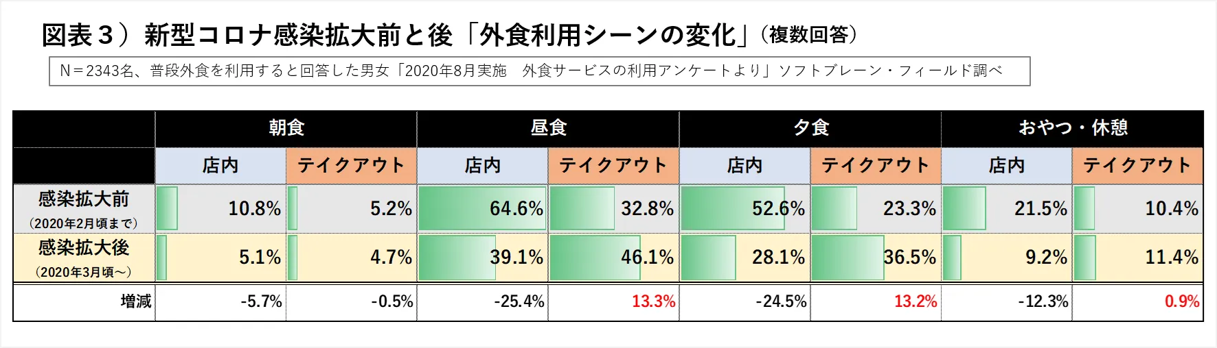 テイクアウトの割合は、「昼食(32.8%→46.1%)」と「夕食(23.3%→36.5%)」では、ともに増加した一方で、店内飲食の割合は、「昼食(64.6%→39.1%)」、「夕食(52.6%→28.1%)」となり、特に感染拡大後の夕食の店内飲食の割合においては、およそ半数の減少となりました。