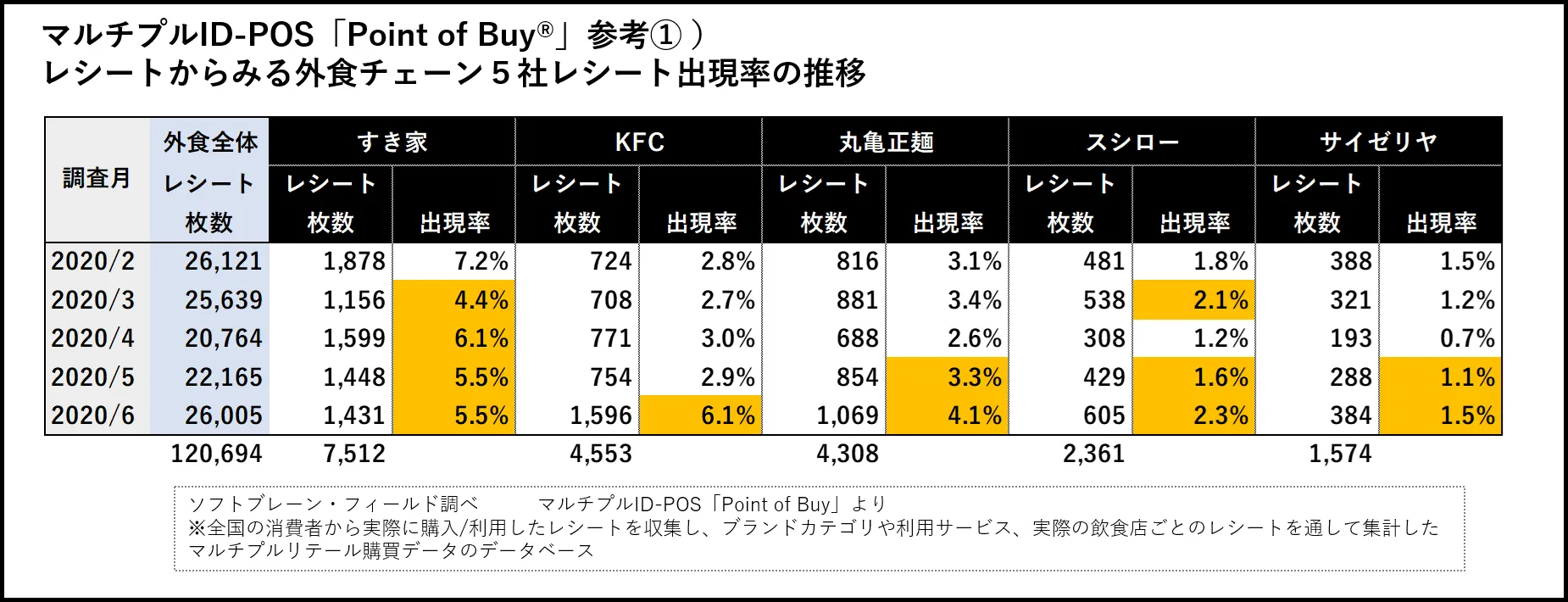次からは、利用が増えたといった内容のコメントがみられた外食チェーン5社「すき家(ゼンショーホールディングス)」・「ケンタッキーフライドチキン(日本KFCホールディングス)」・「丸亀正麺(トリドールホールディングス)」・「スシロー(あきんどスシロー)」「サイゼリヤ(サイゼリヤ)」をセレクトし(レシート枚数順に記載)、全国のアンケートモニターから独自に収集する「マルチプルID-POS購買理由データPoint of Buy(R)」から、外食全体のレシートからそれらチェーンを利用のレシート出現率をみて、各社が実施した、コロナ禍における売上回復の施策を利用者のコメントから探ります。(調査期間:2020年2月~6月、外食チェーン利用のレシート合計120,694枚)