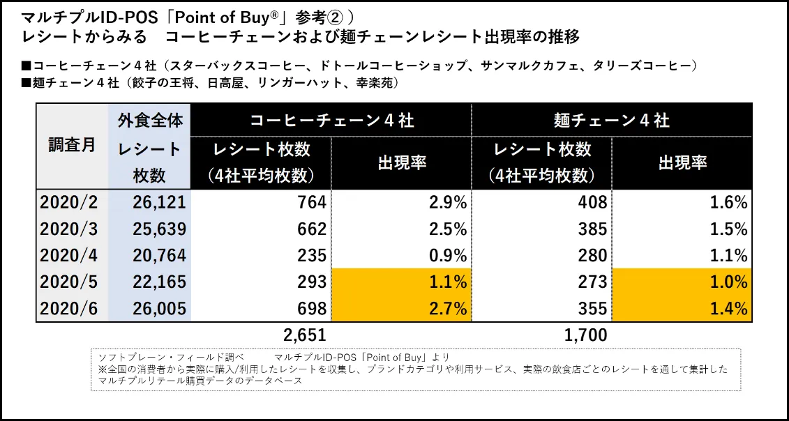 参考までに、コーヒーチェーン4社(スターバックスコーヒージャパン・ドトールコーヒーショップ・サンマルクカフェ・タリーズコーヒー)および、麺チェーン4社(餃子の王将・日高屋・リンガーハット・幸楽苑、レシート枚数順に記載)の平均レシート出現率の推移をみると、緊急事態宣言中の4月・5月については、2月のレシート枚数のおよそ半数となり、現在も時短営業を強いられている厳しい状況下ですが、5月から6月においてはレシート枚数が増加の傾向がみられました。