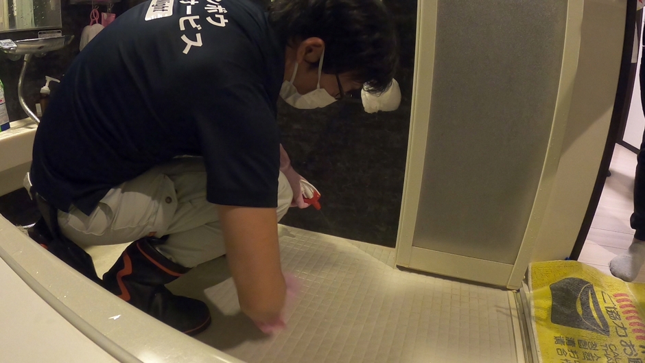 夜8時。東京から1時間15分かけて訪れた先は埼玉県のとある住宅街。現在、5人目のお子さんを妊娠中だという依頼者は、日中は看護師をしているうえに帰宅すると4人の子育てや家事で大忙し。「子どもたちが寝静まり、一段落着いた夜に浴室の床掃除を」と、藤田さんに依頼しました。スポンジやブラシを使わず手で床に洗剤を塗り付けて汚れを落としていく藤田さん。声が若干小さめなのも夜間だからこその気づかい。黒ずみや赤カビで汚れていた床が15分ほどできれいになりました!