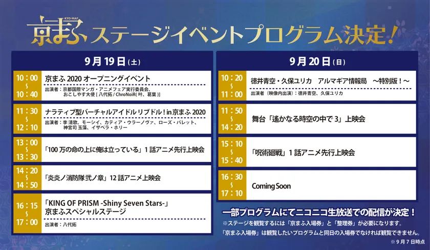 一部プログラムではニコニコ生放送の配信も決定しました。ステージイベントは、ロームシアター京都 サウスホールで開催。