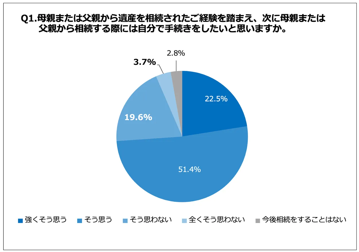 「Q1.母親または父親から遺産を相続されたご経験を踏まえ、次に母親または父親から相続する際には自分で手続きをしたいと思いますか。」(n=107)と質問したところ、「そう思わない」が19.6%、「全くそう思わない」が3.7%という回答となりました。