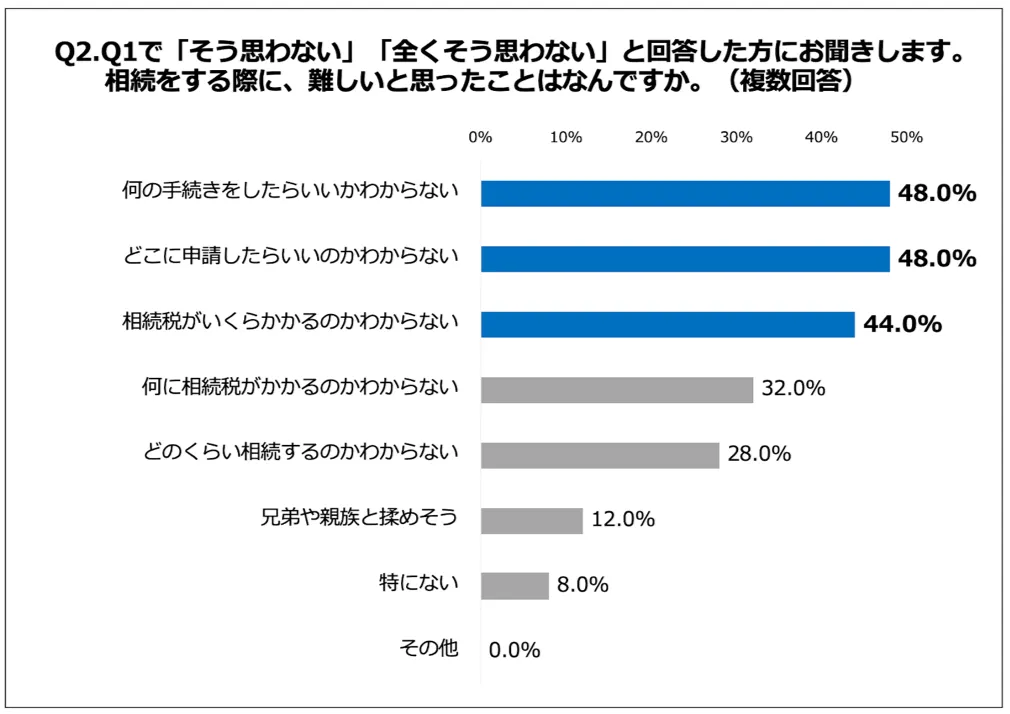 「Q2.Q1で「そう思わない」「全くそう思わない」と回答した方にお聞きします。相続をする際に、難しいと思ったことはなんですか。(複数回答)」(n=25)と質問したところ、「何の手続きをしたらいいかわからない」が48.0%、「どこに申請したらいいのかわからない」が48.0%、「相続税がいくらかかるのかわからない」が44.0%という回答となりました。