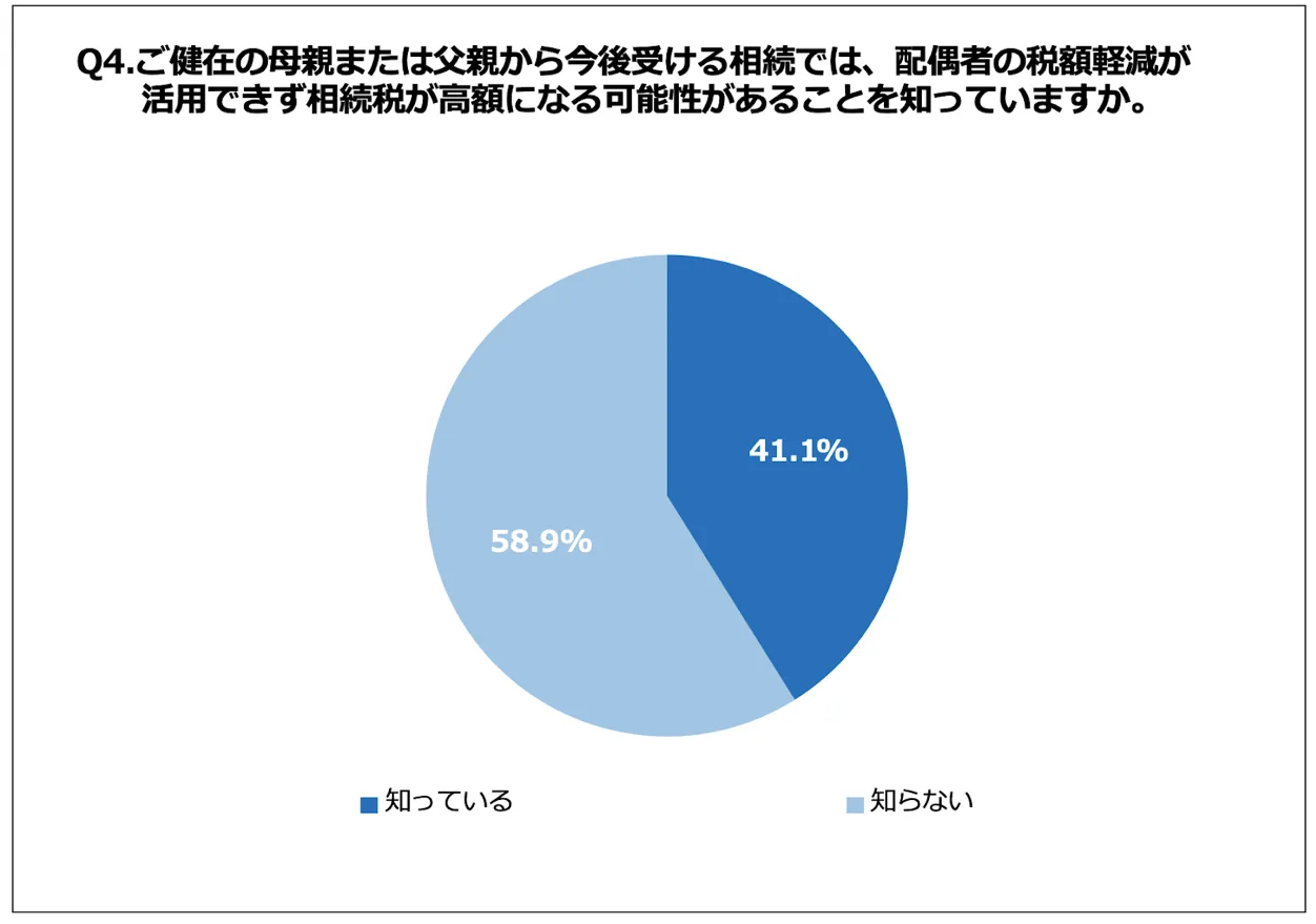 「Q4.ご健在の母親または父親から今後受ける相続では、配偶者の税額軽減が活用できず相続税が高額になる可能性があることを知っていますか。」(n=107)と質問したところ、「知っている」が41.1%、「知らない」が58.9%という回答となりました。