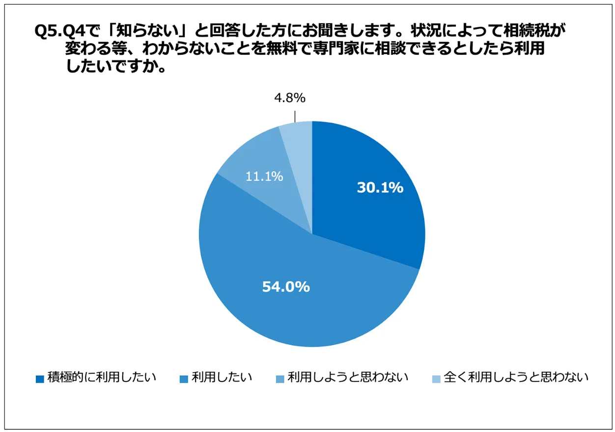 「Q5.Q4で「知らない」と回答した方にお聞きします。状況によって相続税が変わる等、わからないことを無料で専門家に相談できるとしたら利用したいですか。」(n=63)と質問したところ、「積極的に利用したい」が30.1%、「利用したい」が54.0%という回答となりました。